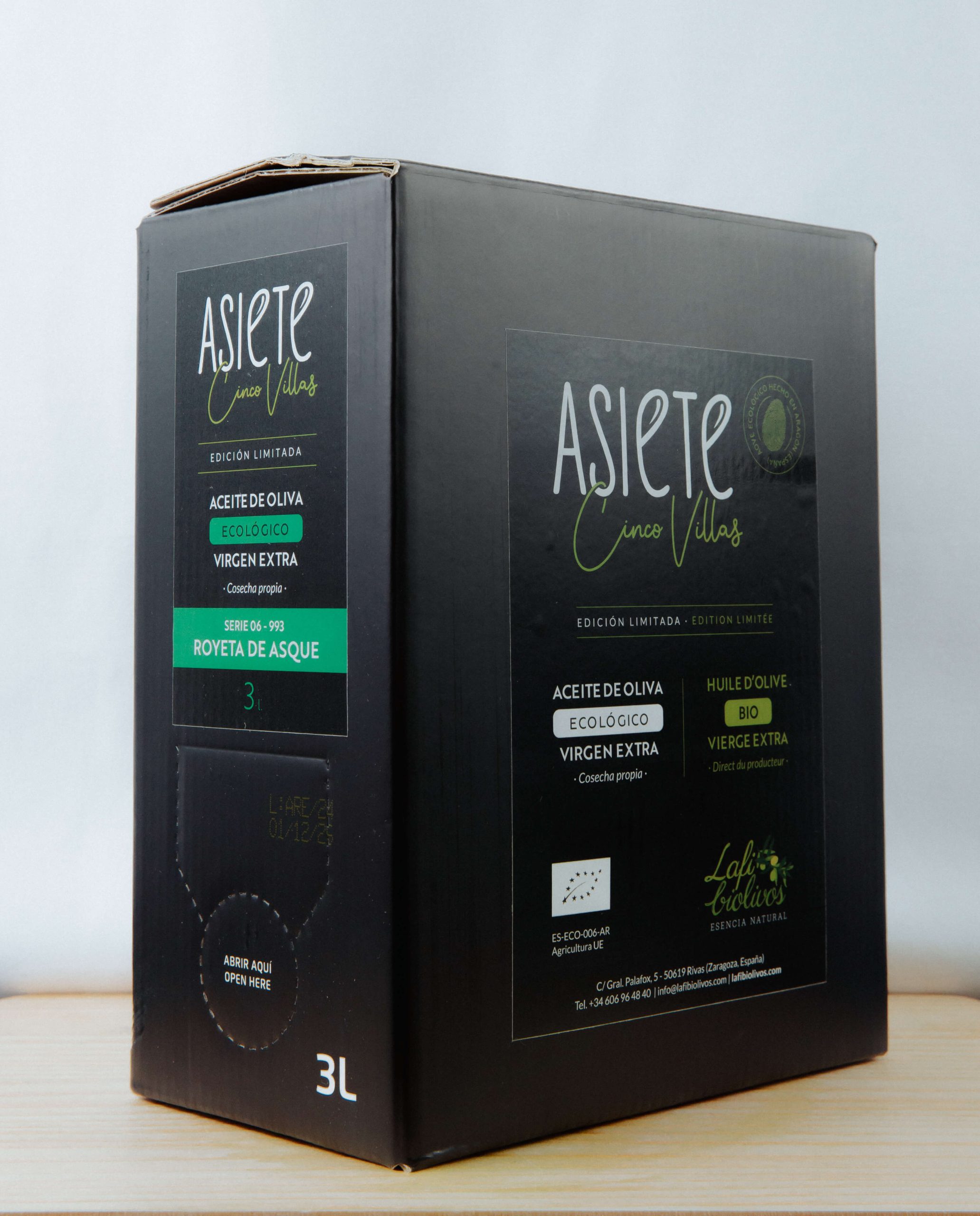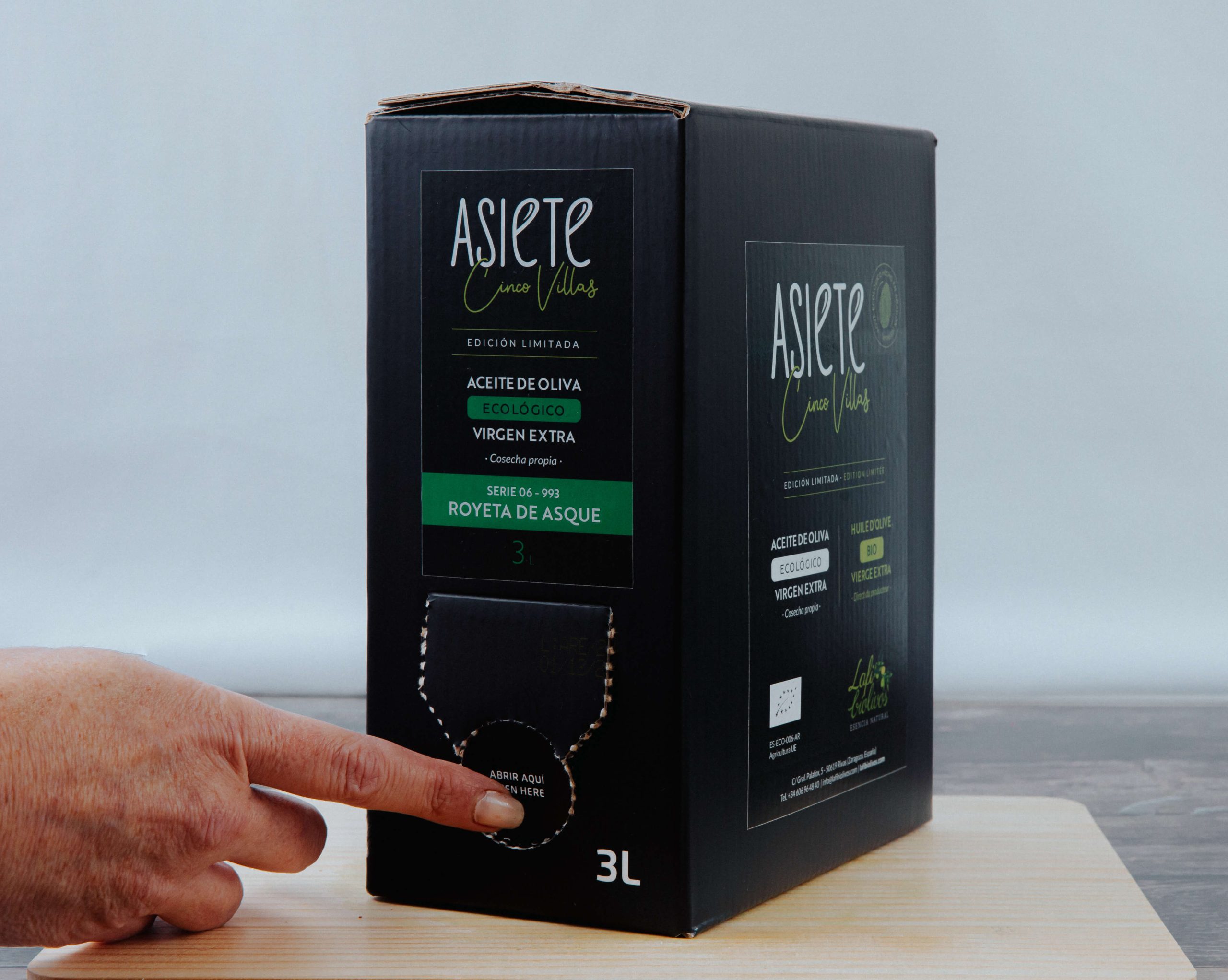 El aceite de oliva virgen extra ecológico de la variedad Royeta de Asque se comercializa en envases de vidrio de 25 y 50cl y en bag in box de 3L. Este último envase ayuda a conservar durante más tiempo las propiedades más saludables del producto al no estar en contacto con oxígeno y luz y es más compacto por lo que ocupa menos espacio.
